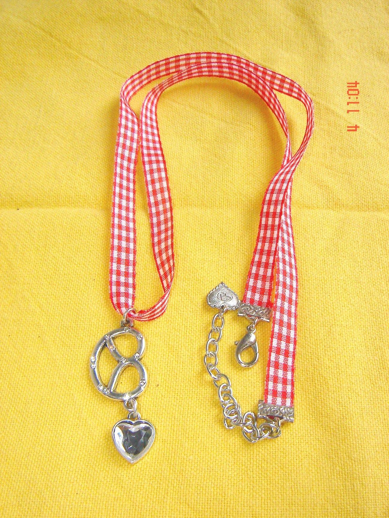 Dirndlkette Trachtenkette kariertes Band rot weiß mit Brezel und Herz Z p