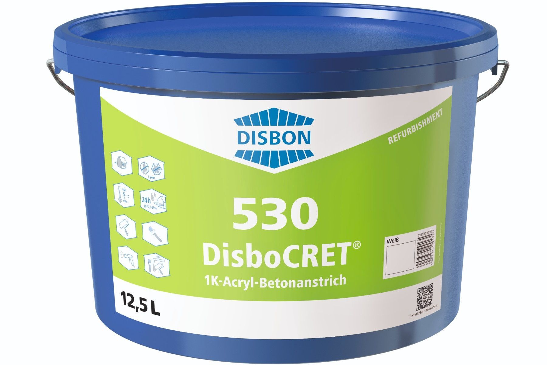 Disbon 530 DisboCRET 1K-Acryl-Betonanstrich 12,5 Liter weiß Details für Disbon 530 DisboCRET 1K-Acryl-Betonanstrich 12,5 Liter weiß: Hochwertige, lösemittelfreie Schutzbeschichtung mit geringer Verschmutzungsneigung und hohem Lichtindex. Verwendungszweck: Vielseitig verwendbare emissionsminimierte,