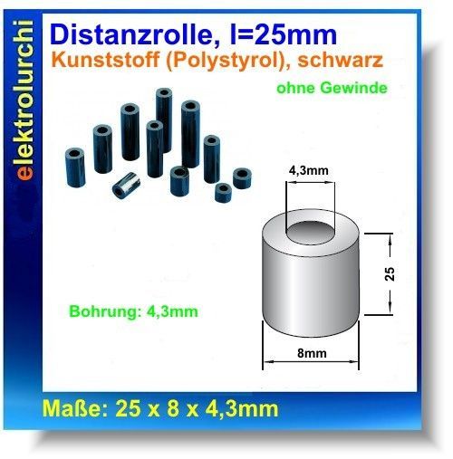 Sie bieten hier auf folgenden Artikel 10 Stück Distanzrolle 25mm 8 x 4,3, Abstandsrolle, Distanzhülse Rolle Eigenschaften Länge: 25,0mm, Durchmesser: 8mm Innendurchmesser 4,3mm Material: Kunststoff (Polystyrol) Gewinde: Nein Farbe grau