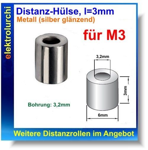Sie bieten hier auf folgenden Artikel 8 Stück Distanzrolle Metall, 3x6x3,2mm Abstandsrolle Distanzhülse,Distanz-Hülsen Eigenschaften Länge: 3,0mm Durchmesser: 6mm Innendurchmesser 3,2mm Material: Metall (silber glänzend) Gewinde: Nein