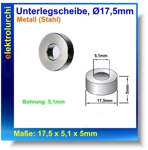 Sie bieten hier auf folgenden Artikel 4 Stück Distanzscheibe Rolle Stahl h=5mm x 17,5mm, innen=5,1mm Eigenschaften Höhe: 5,0mm Außenurchmesser: 17,5mm Innendurchmesser 5,1mm Material: Stahl Gewinde: Nein
