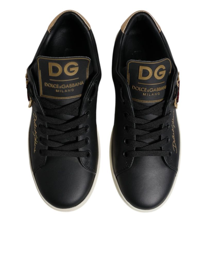 Dolce & Gabbana Dolce & Gabbana Black Leather Gold Red Heart Sneakers Shoes