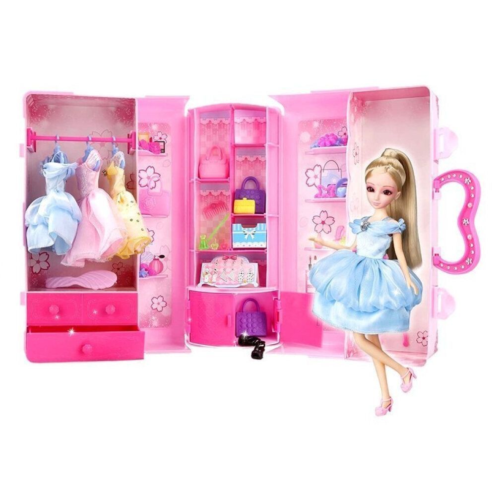 Doll, Model. Set of Clothes. Dressing. Jewelry in a Suitcase