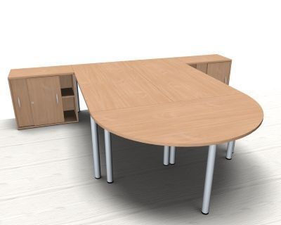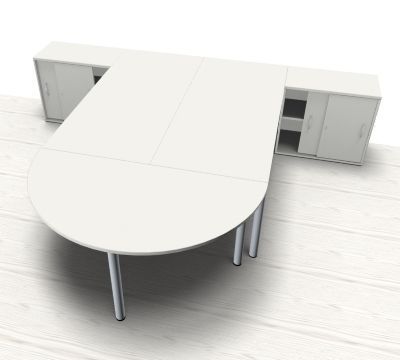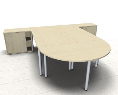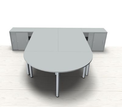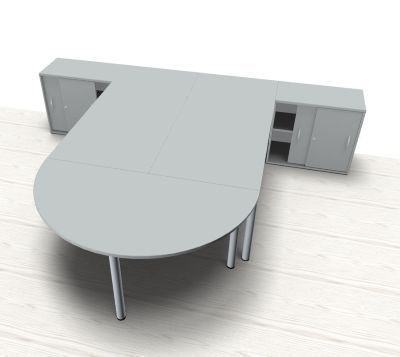 Doppelarbeitsplatz GVS mit Anstellschiebetürschränken, Stellfläche 320x260 cm bestehend aus 2x Schrebtisch mit Vierfuß-Gestell, 2x Anstell-Schiebetürenschrank und 1x Besprechungs-Anstelltisch, Halbkreis. Dekorfarbe in Ahorn Buche Lichtgrau oder Weiß.