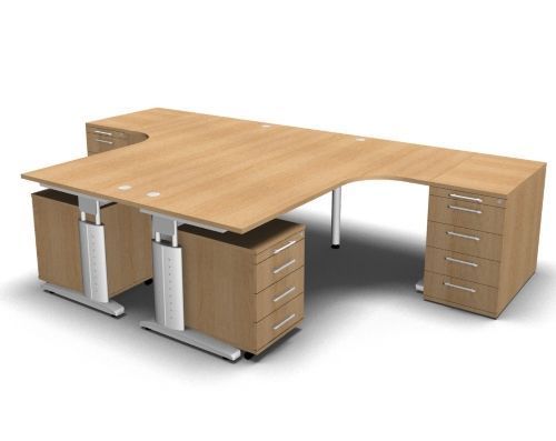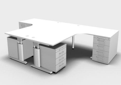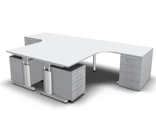 Doppelarbeitsplatz U20 mit Rollcontainer Stellfläche 325,6 x 200 cm bestehend aus 2x Winkelschreibtisch (beidseitig montierbar), 2x Standcontainer mit 4 Schubladen und 2x Rollcontainer mit 3 Schubladen. Dekorfarben in Ahorn Buche Lichtgrau Nussbaum Eiche oder Weiß.