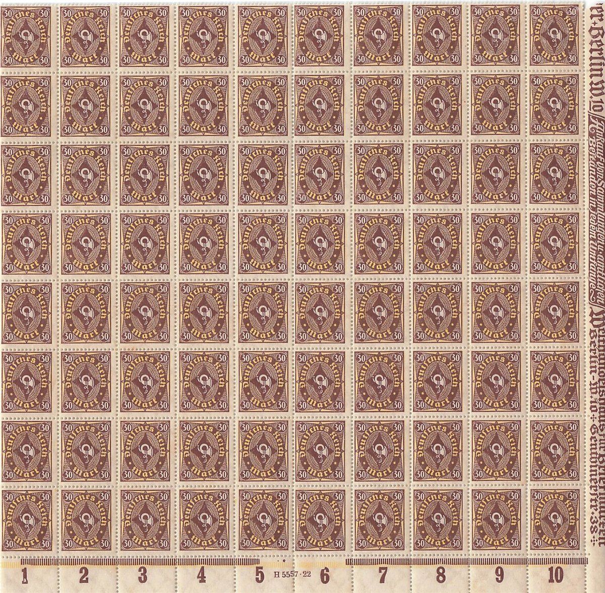 Bezeichnung Designation: DR Mi.-Nr.: 208 w, Bogenteil, HAN-Nr.: H 7288 * 22 Land Country: Deutsches Reich Jahr Year: 1922 Position im Bogen Position in the arc: Oberrand, Unterrand Zustand Status: postfrisch mint Sonstiges Miscellaneous: altersbedingt age-related, Einrisse im unteren Bereich (Zähnun