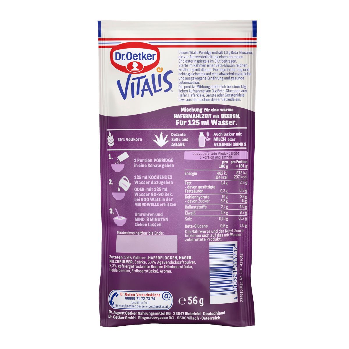 Dr. Oetker Vitalis Porridge Beeren für eine warme Hafermahlzeit 56g