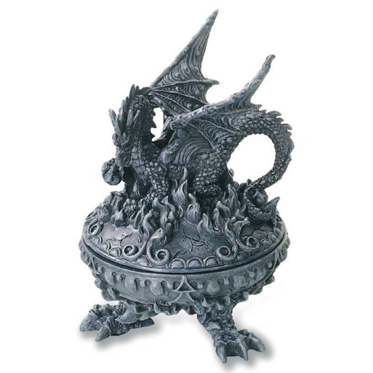 Drache sitzt auf runder Schmuckdose mit Drachenkrallen