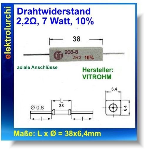 Drahtwiderstand 2,2 Ohm, 7 Watt, 10% Widerstand Hochlast, Vitrohm, 2St.