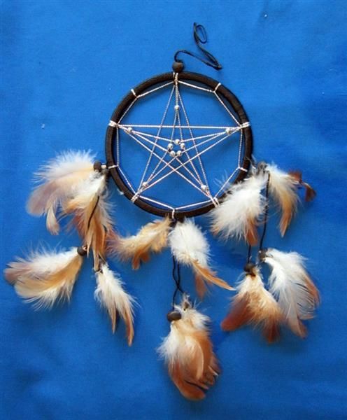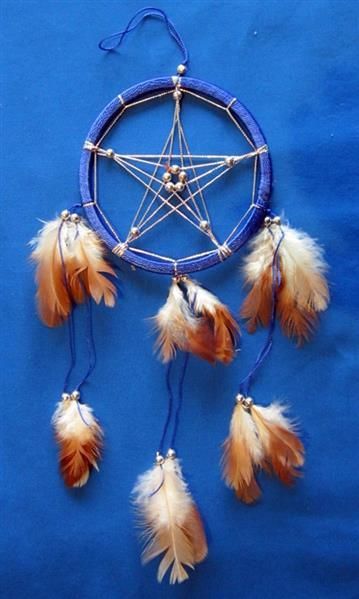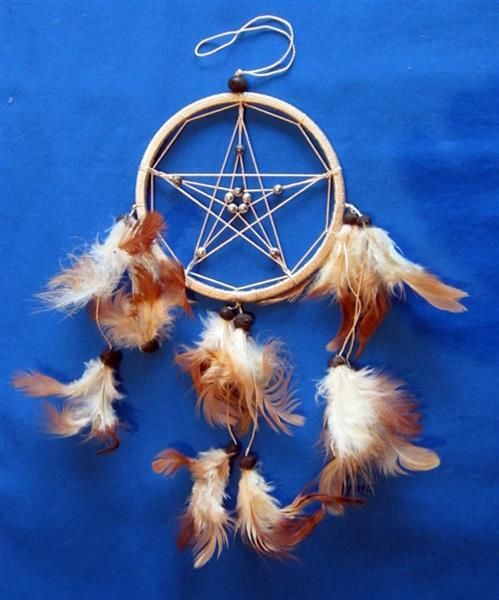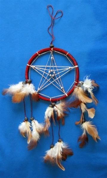 Das Pentagramm ist mit Silberfaden geknüpft und regenbogenfarbenen Perlen versehen, mit Garn umwickelt und Federn behangen. Durchmesser 11,5 cm. Mir farbigem Ring (wahlweise blau, natur (beige), braun, schwarz), Wunschfarbe bei Bestellung bitte angeben.
