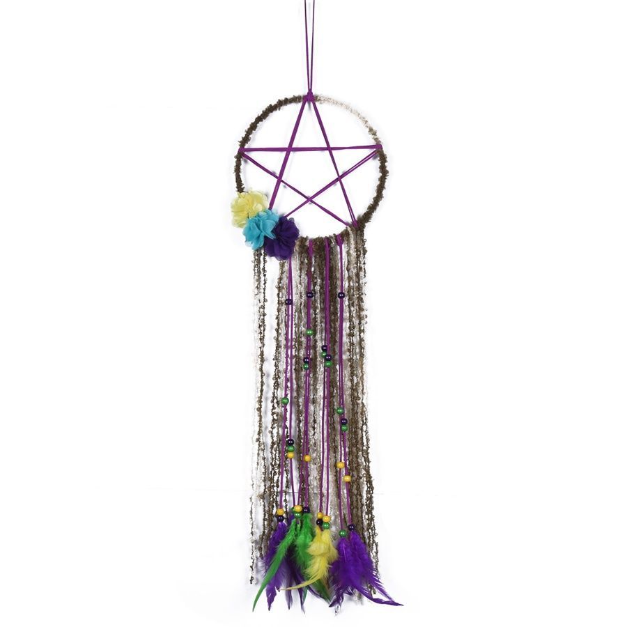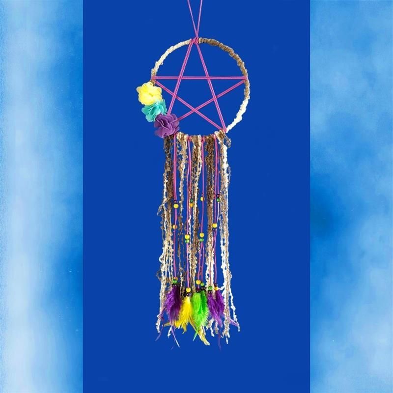 Dreamcatcher Pentagramm mit Wollfäden + bunten Federn 21 x 65 cm Traumfänger
