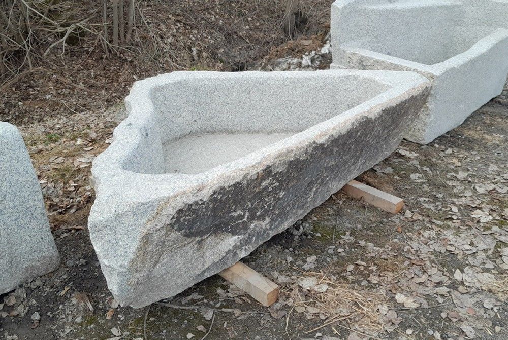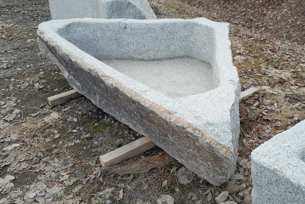 Dreieckiger Granitbrunnen, exklusives Einzelstück, ideal als Brunnenbecken für Wasser Seitenlängen - lange Seite: 260 cm, kurze Seiten: jeweils 200 cm Höhe: 60 cm Gewicht: 1700 kg Preis: Euro 3024,37 zzgl. MwSt. = Euro 3599,-- Versand per Spedition und kostenlose Selbstabholung möglich. Wir haben me... Mehr