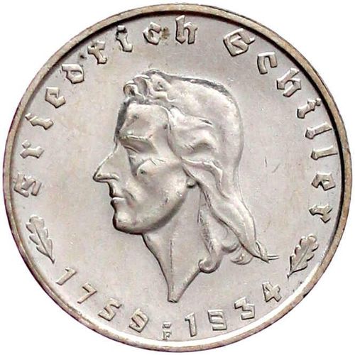 Drittes Reich Deutschland Silbermünze 2 Reichsmark 1934 F, Friedrich SCHILLER, vorzüglich Stempelglanz, Katalog Jaeger 358