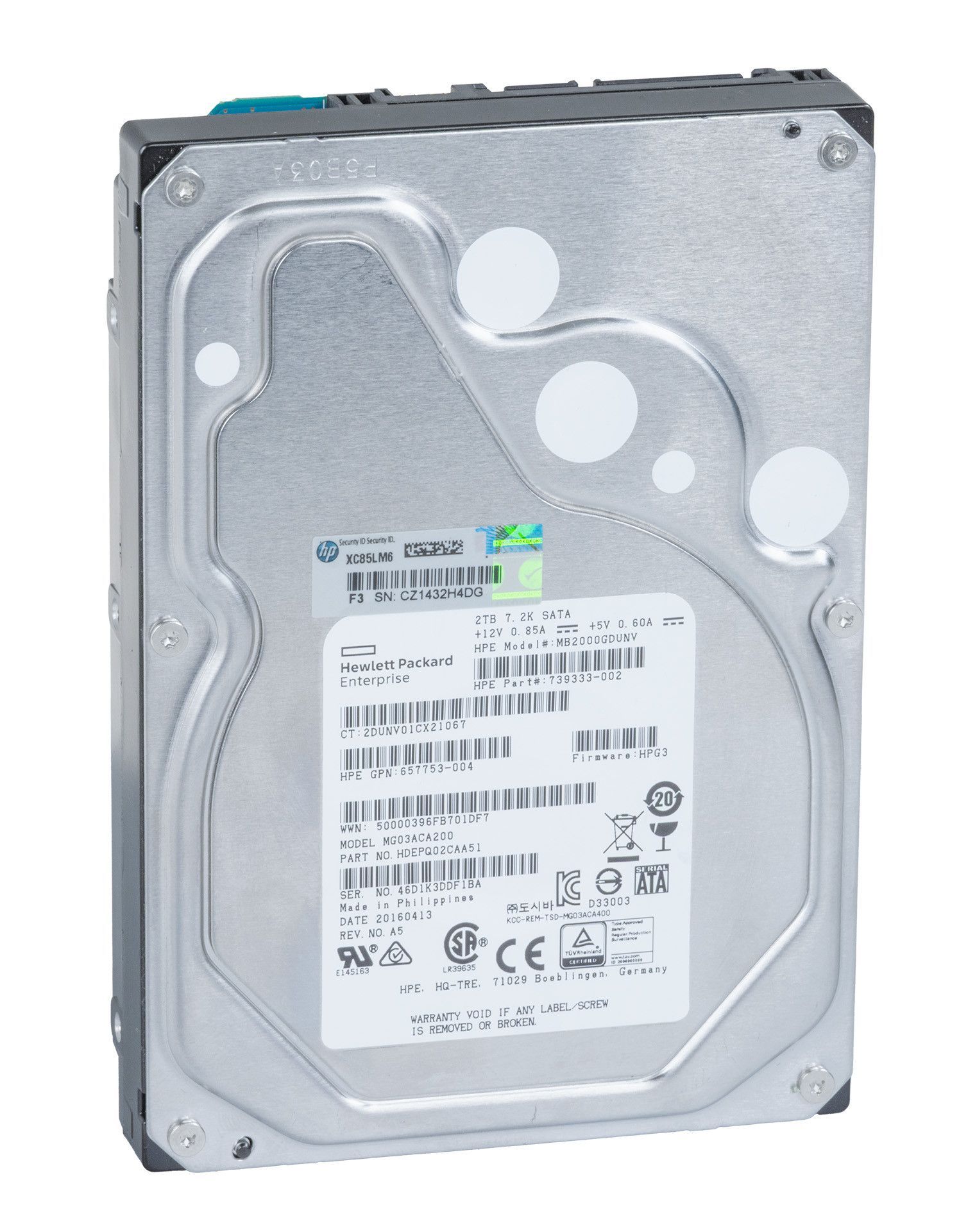 Drive 2TB HDD SATA 6Gbit 7.2K Toshiba HPE MG03ACA200 MB2000GDUNV 739333-002 Toshiba MG03ACA200 2TB SATA HDD with HPE MB2000GDUNV 739333-002 signaling in 3.5” format. The 2TB SATA HDD MG03ACA200 MB2000GDUNV 739333-002 with 6Gbit bus bandwidth for high throughput and stability in demanding environment