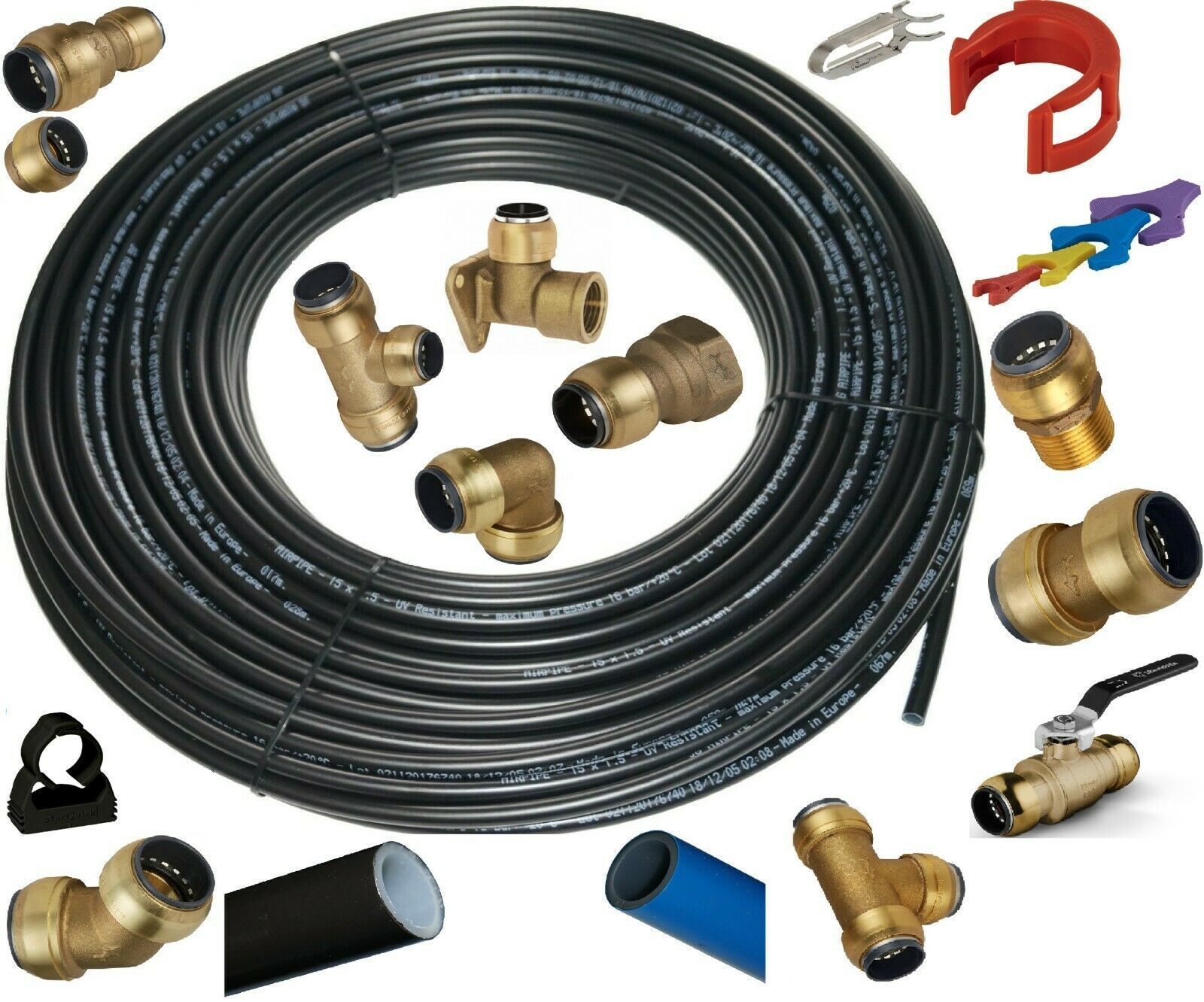gerader Verbinder, Winkel, T-Stück, Kugelhahn, Einschraubverbinder, Aufschraubverbinder, Wandwinkel, Endkappe, Demontage-Clip