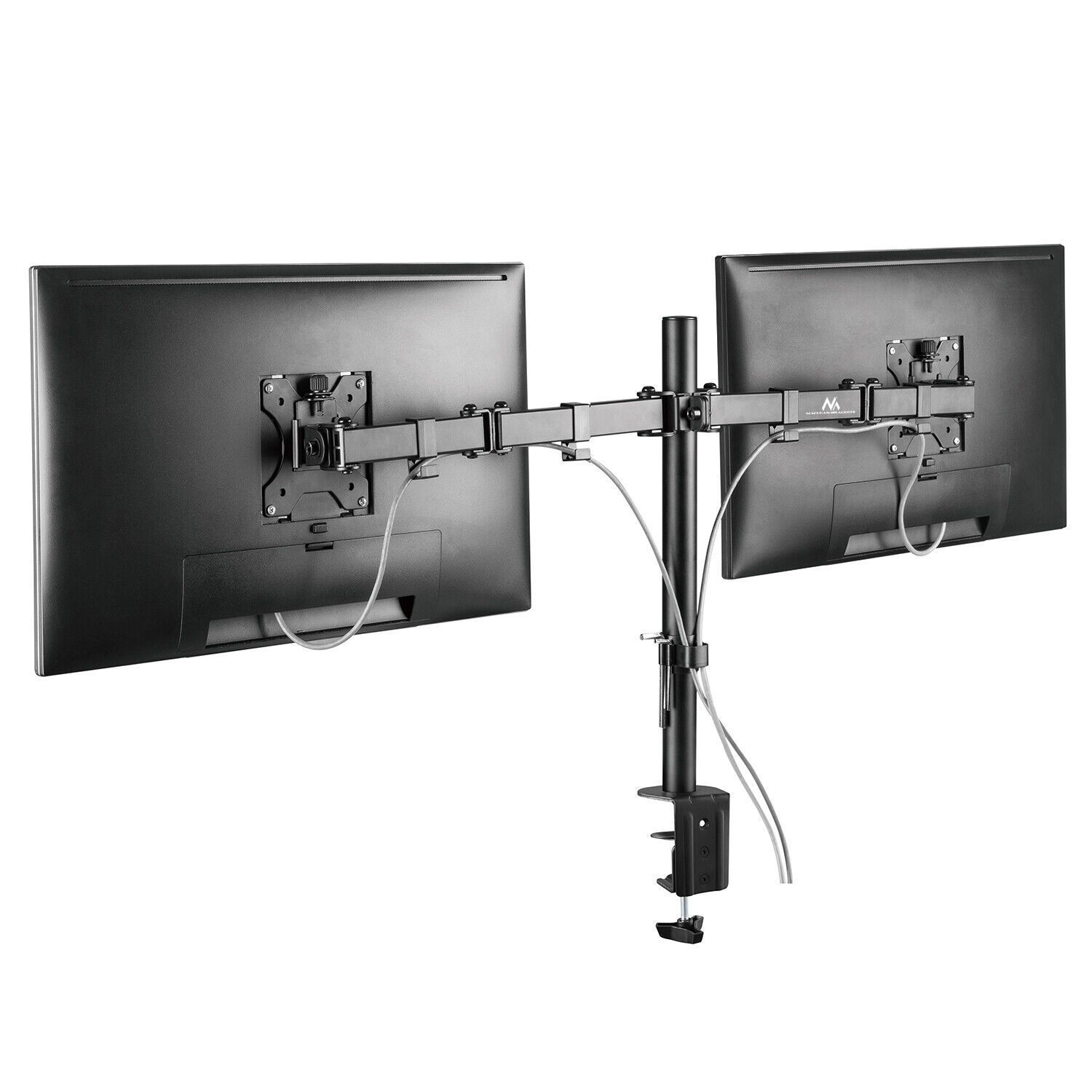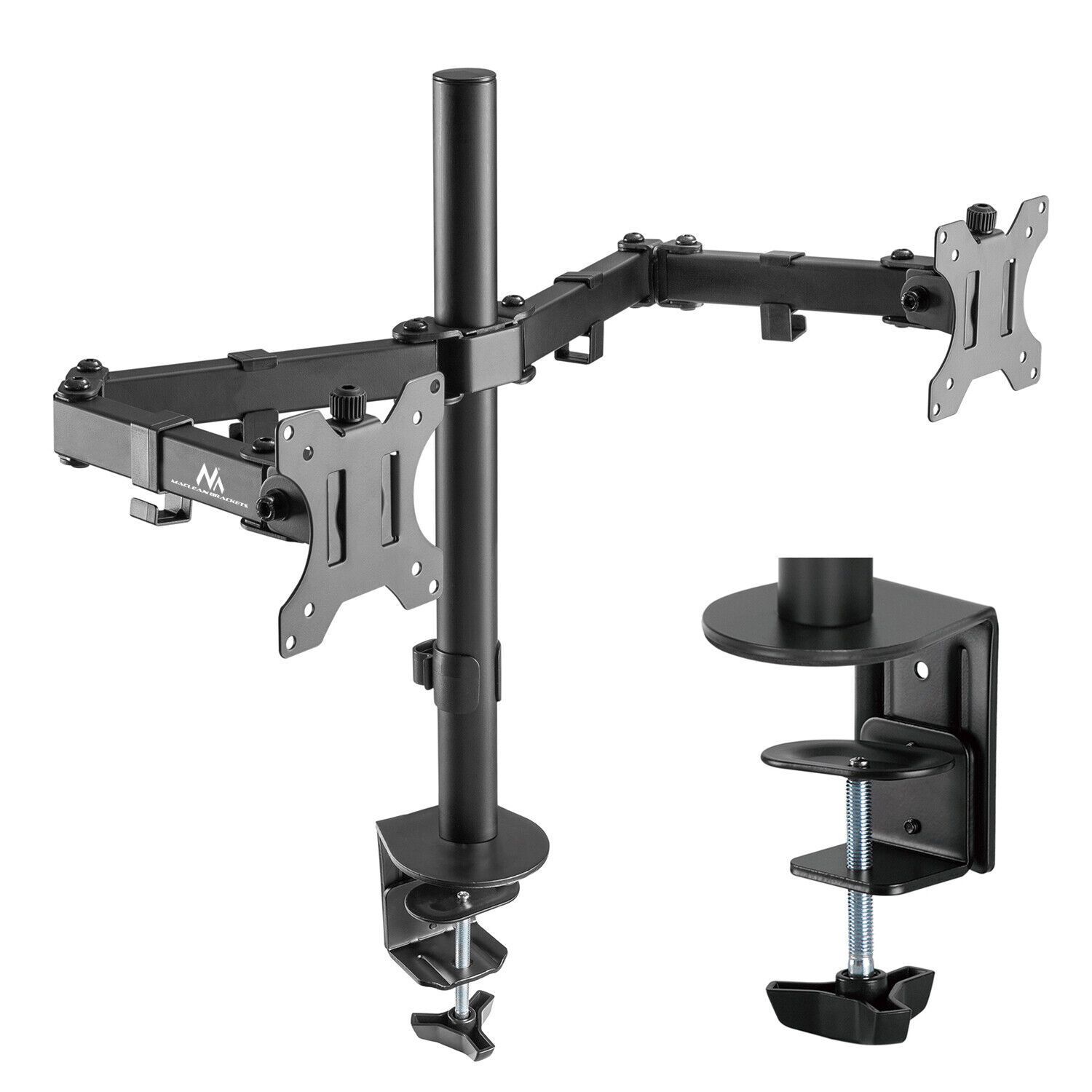 Monitor Tischhalterung Maclean MC-884 mit Full Motion Einstellungs Artikelnummer: 65721 - Ausgestattet mit insgesamt 3 Drehgelenken je Monitorarm: einem 360° Gelenk u. zwei 180° Drehgelenke (siehe Skizze) - Full Motion für einen optimalen Blickwinkel : Höhenverstellbar, Schwenkbar, Neigbar u