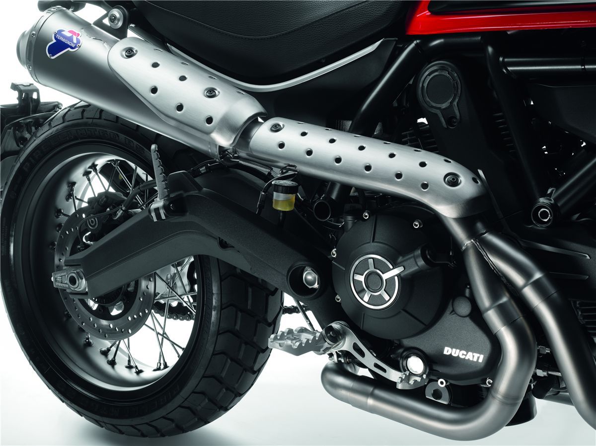 Original DUCATI Racing Auspuffanlage Race-Line von TERMIGNONI für Ducati Scrambler 800 2015-2018 Von Termignoni produziert, geben die oben liegenden 2-1 Auspuffkrümmer und der Racing-Schalldämpfer mit entfernbarem dB-Killer mit ihrem ästhetischen Aspekt einen deutlichen Hinweis auf die Enduro-und Fl