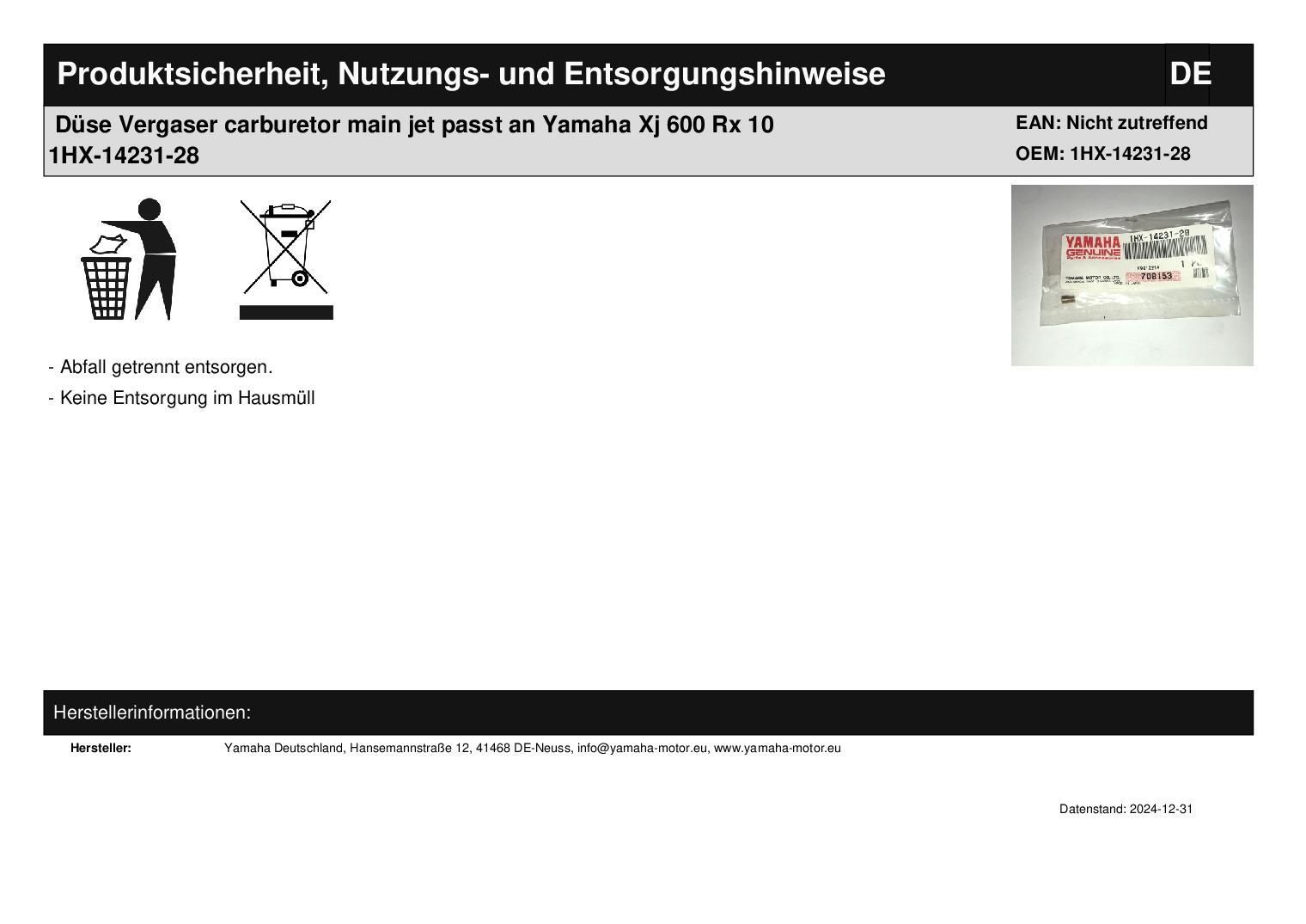 Düse Vergaser carburetor main jet passt an Yamaha Xj 600 Rx 10 1HX-14231-28 In dieser Auktion gibt es folgenden Artikel zu kaufen: Düse (siehe Foto) Modell: passend für Yamaha XJ 600 Bj.: 1996 RX 10 Bj.: 2003 Lieferumfang: siehe Foto Artikelzustand: neu aus Geschäftsauflösung, mit minimalen Lagerspu