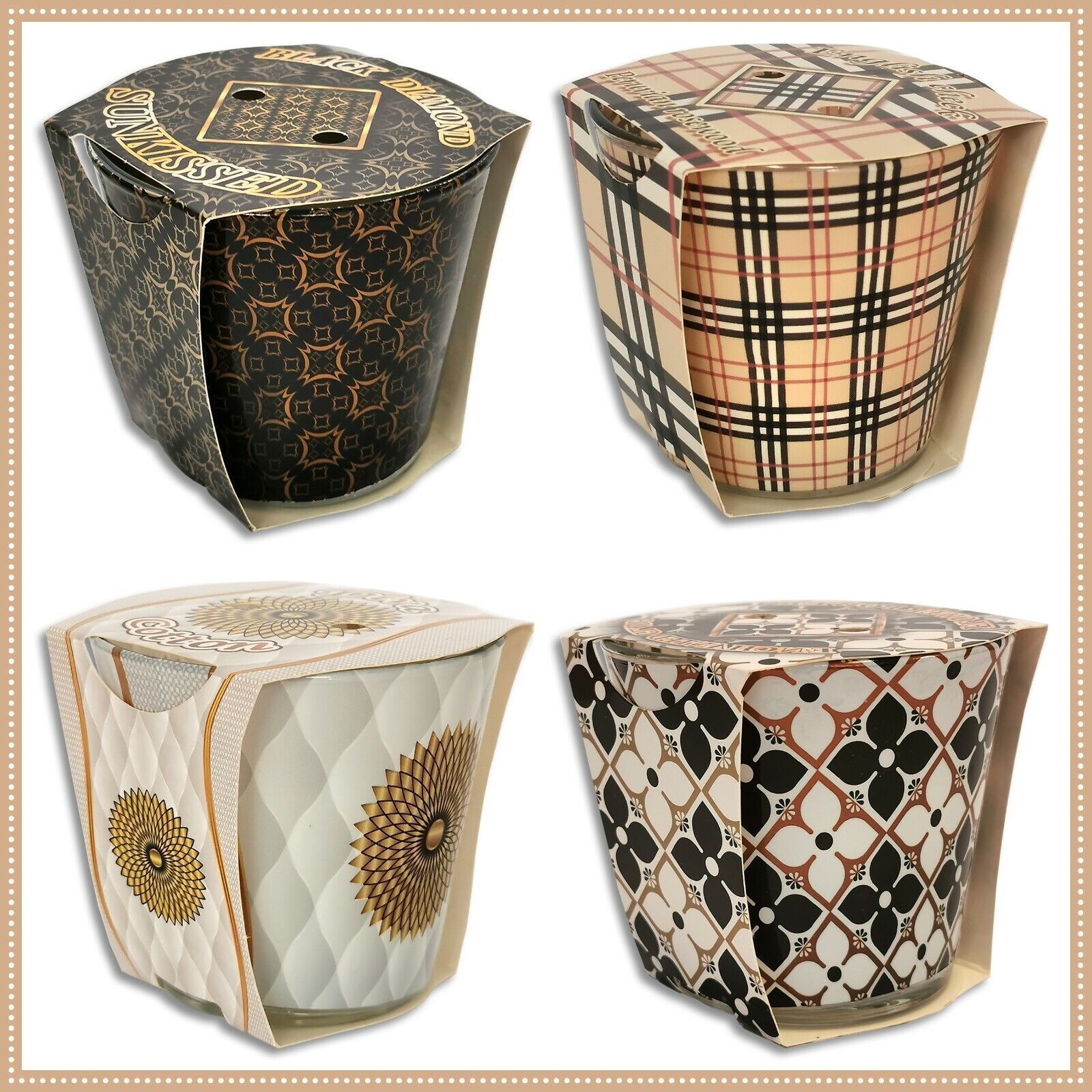 391 g Duftkerze im Glas Duftkerzen in Gläsern mit jeweils 4 verschiedenen stabilen und eleganten Design. Die Duftkerzen sind 8 cm hoch und haben einen Durchmesser von 9 cm. Auch als perfektes Geschenk für Ihre Lieben zur Weihnachtszeit! Erhältlich in den Duftrichtungen zur Auswahl: Euro Black Diamon