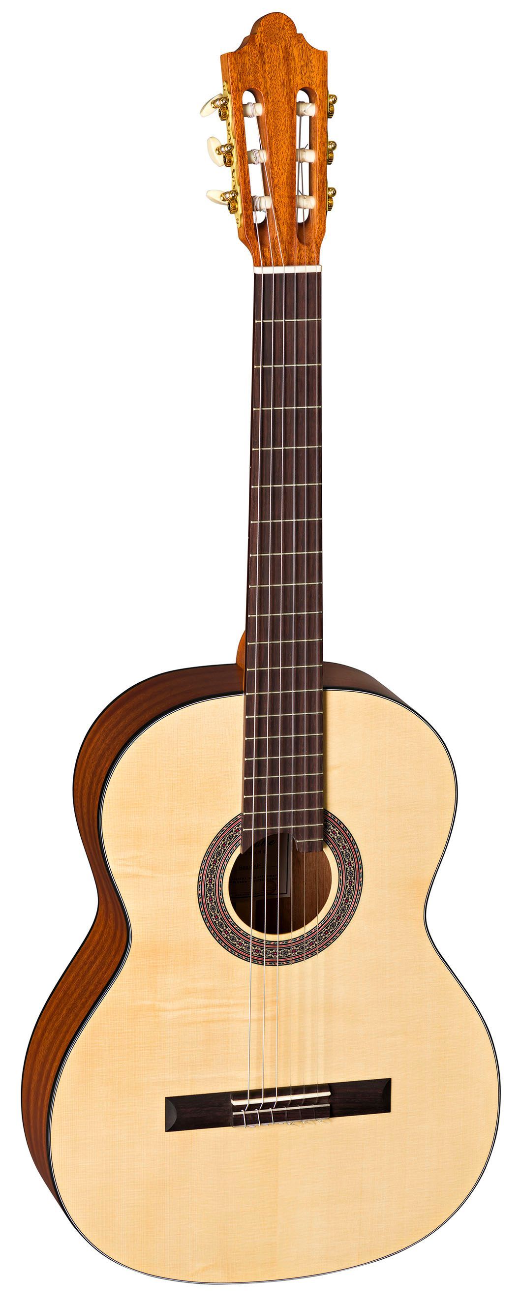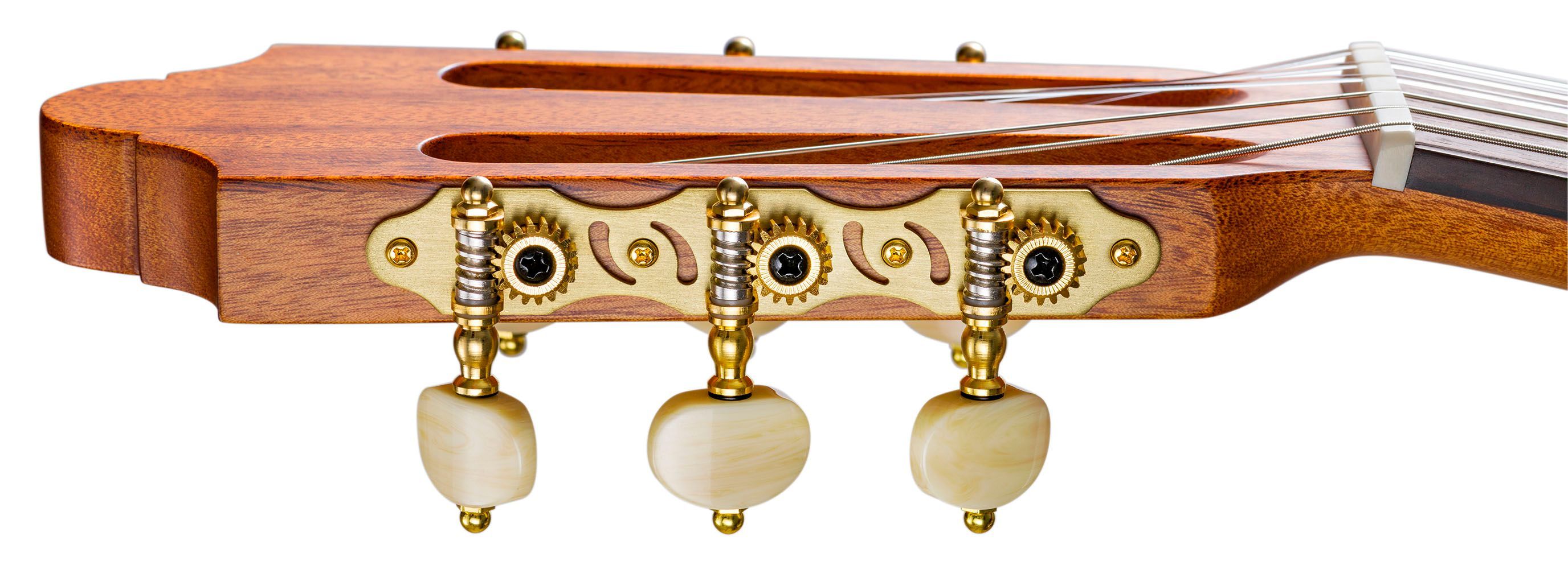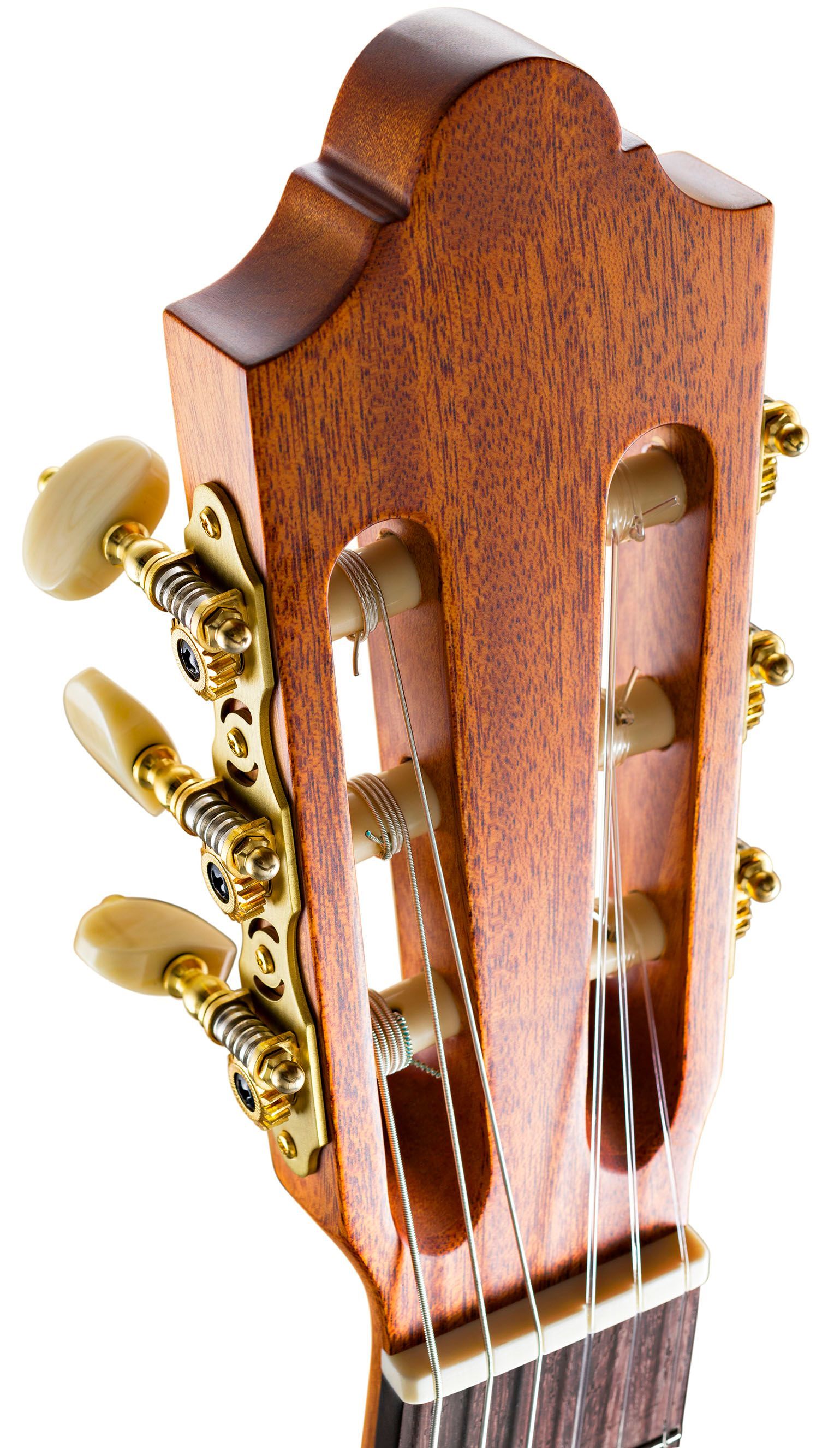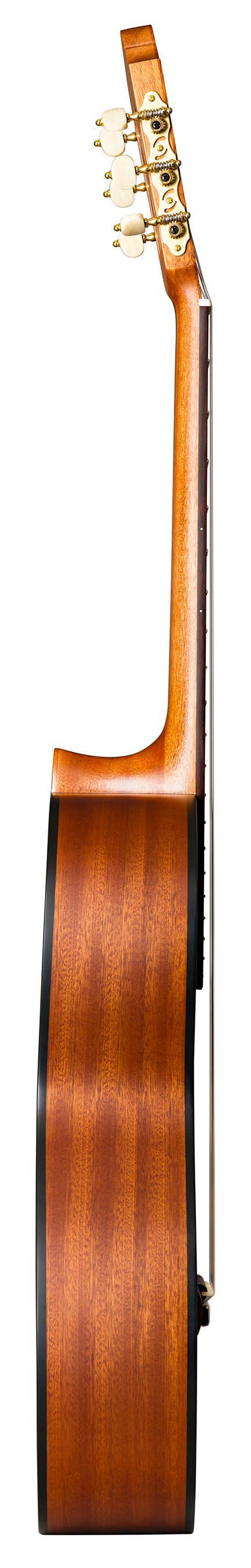 Duke Basis MF 52 - 1 2 Decke: schweizer Fichte, massiv Boden und Zargen: Mahagoni Hals: Cedro mit Palisanderverstärkung Griffbrett: Palisander Mensur: 52 cm Sattelbreite: 46 mm 20 Bünde Steg: Palisander Sattel und Stegeinlage: Knochen Mechaniken: DER JUNG Saiten: Savarez Farbe: Natur Finish: satin j