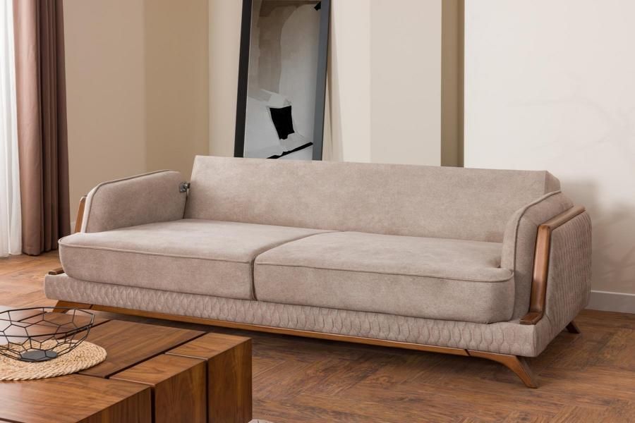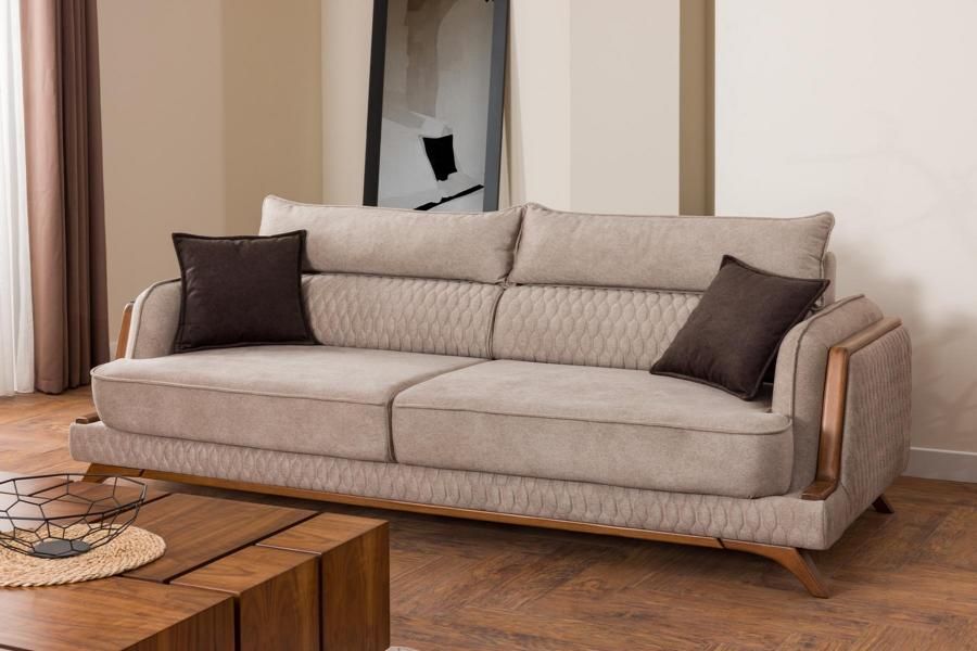 Dunkelbraun 3-Sitzer Sofa Stoffbezug Holzdetails Retro Skandi Stil Wohnzimmer