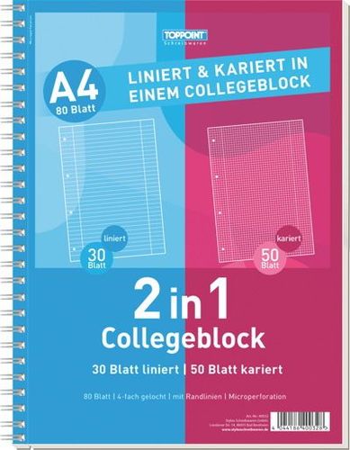 Duo Collegblock Format: DIN A4 liniert holz- und chlorfreies Papier 50 Blatt kariert und 30 Blatt liniert mit einer praktischen Ausreißhilfe neben der Spirale