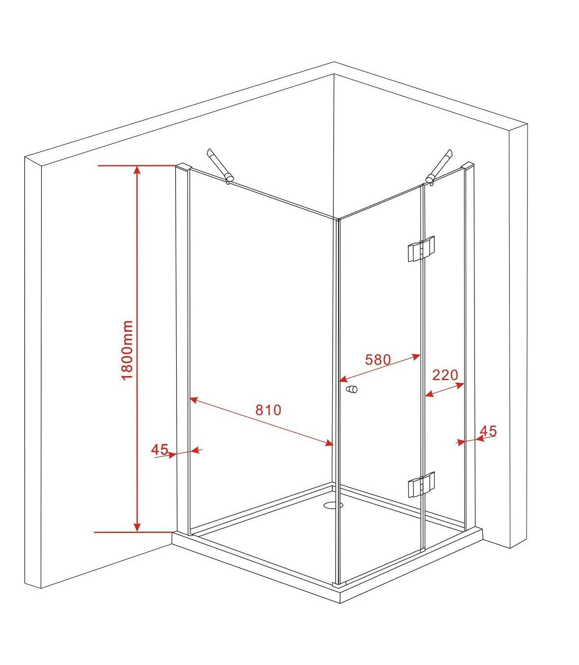 Glasscheiben aus 8 mm Sicherheits-Klarglas (ESG) Glas-Beschichtung zur leichten Reinigung Scharniere und Türgriff aus Messing, verchromt Tür nach außen öffnend hochwertige, verchromte Aluminiumprofile extra geringe Höhe von nur 180 cm bis zu 15 mm Wandausgleich vollständige Verdeckung der Verschraub