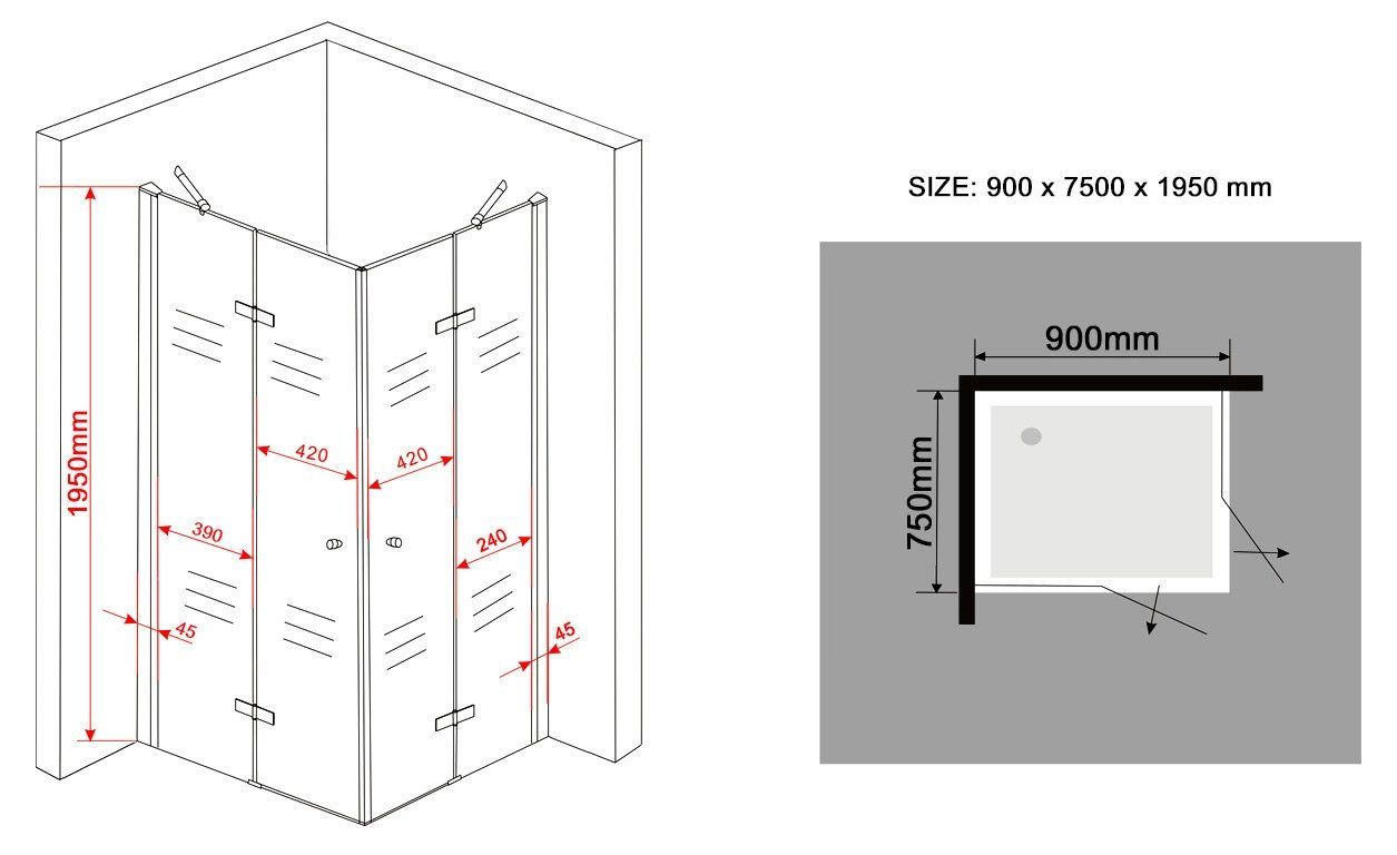Duschkabine CANTO (schwarz) 90 x 75 x 195 cm ohne Duschtasse