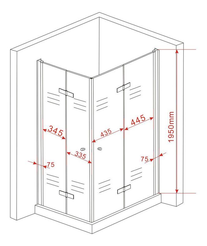 8 mm Glas (rahmenlos) / Alu-Profile / Falttüren / bis 15 mm Wandausgleich / Messing-Scharniere (alu-optik) / Magnetabdichtung / Bodenebene Montage möglich / Links- und Rechtsmontage möglich / Abmessungen: 100 x 80 x 195 cm