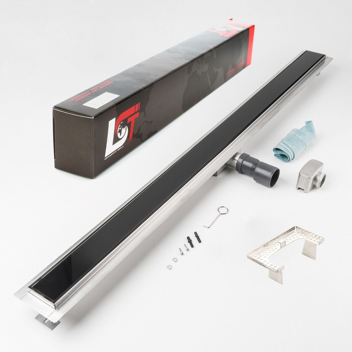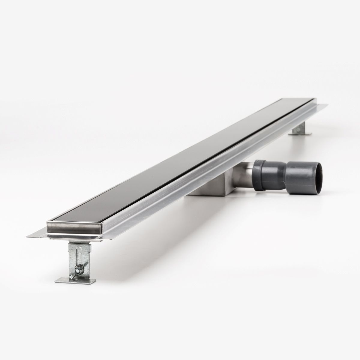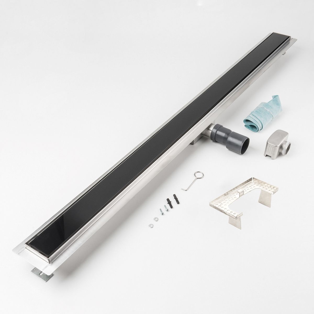 Duschrinne Glas schwarz 1200x70mm Ablaufrinne mit Edelstahl Siphon Haarsieb