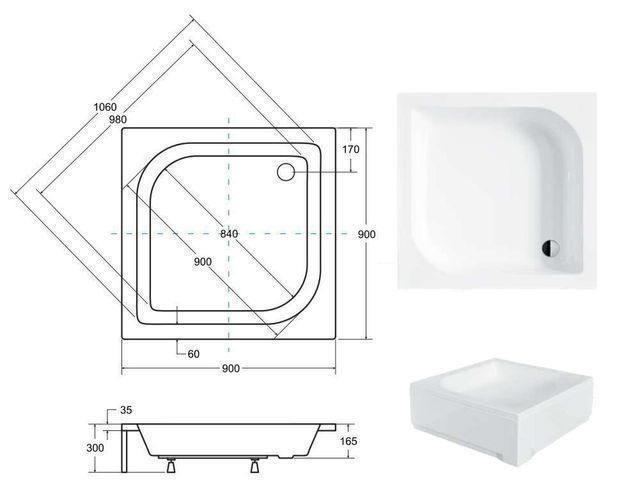 Duschwanne Quadratisch ARES 90x90 Styroporträger Weiß | Ablaufgarnitur & Füße im SET!