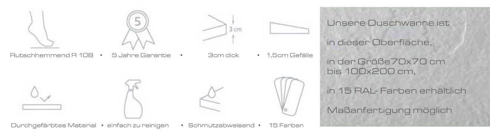 Mineralguss - Duschwanne nur 3 cm hoch für bodenebene bzw. bodengleiche Dusche Kostenloser Versand! Passende Dichtbänder finden Sie in unserem Shop. Lieferung innerhalb 15 Werktage. Lieferbar in insgesamt 15 RAL Farben, sollte Ihre Wunschfarbe im Menü nicht auswählbar sein, schreiben Sie uns bitte n