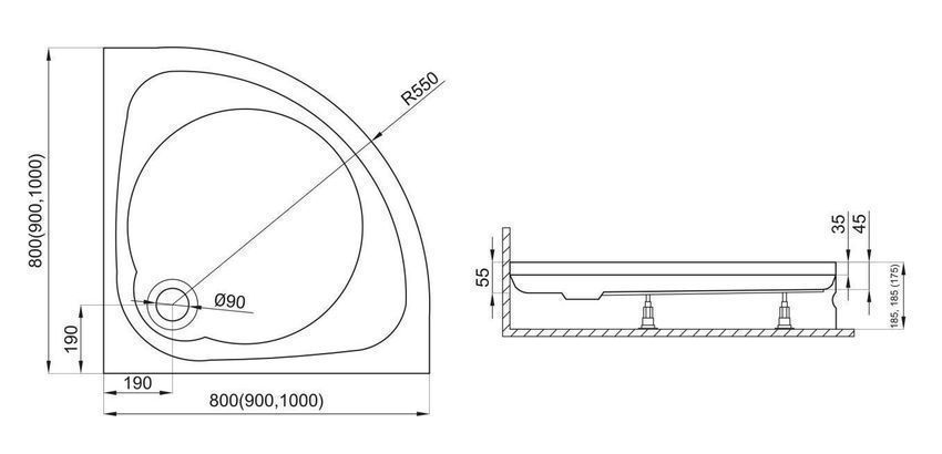 Duschwanne Viertelkreis Acryl NEUER STIL 90x90 Weiß | Ablaufgarnitur & Füße im SET!