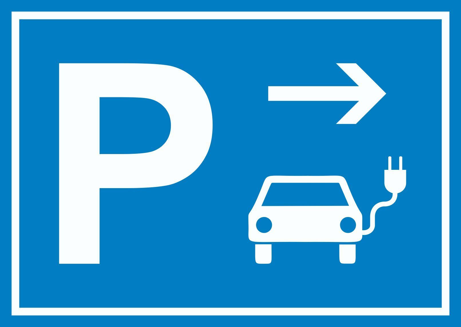 E-Auto Elektrofahrzeug Parkplatz Schild mit Richtungspfeil rechts waagerecht
