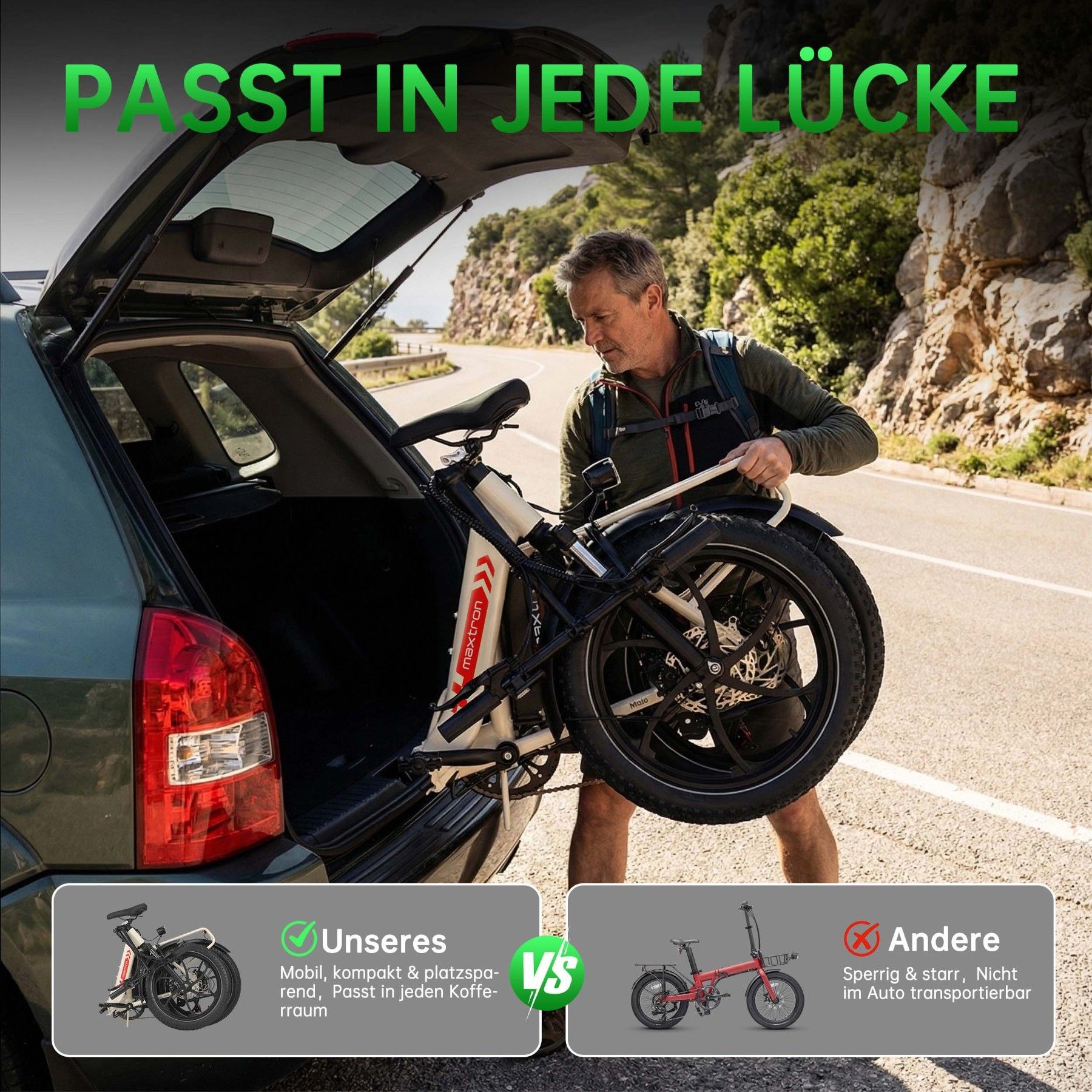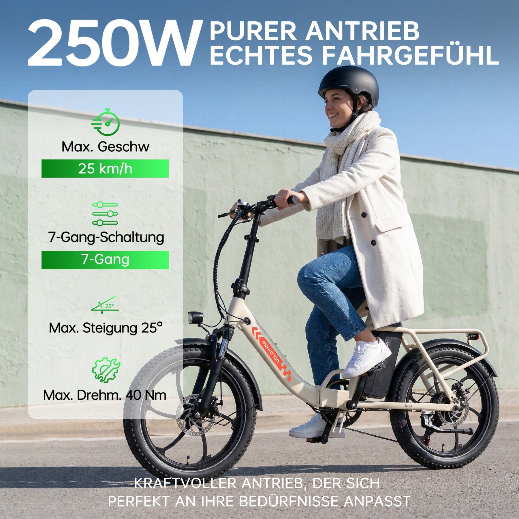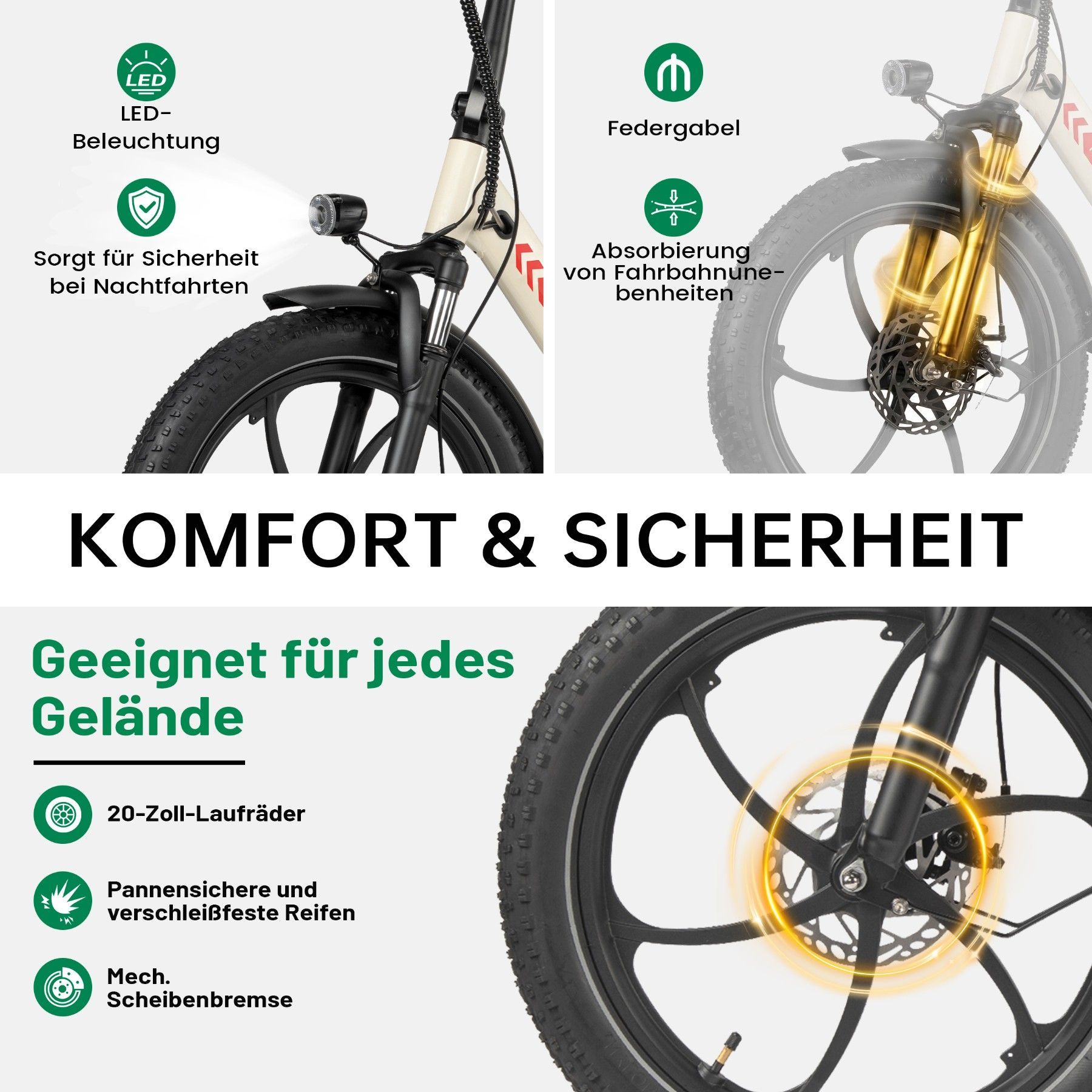 • Bitte lesen Sie vor der ersten Fahrt alle Anweisungen in der Bedienungsanleitung sorgfältig durch. Bevor Sie ein E-Bike kaufen, informieren Sie sich bitte über die örtlichen Verkehrsregeln, ob die Nutzung auf öffentlichen Straßen erlaubt ist, und halten Sie sich an diese. Wir empfehlen das Tragen eines Helms. Stellen Sie sicher, dass das Fahrrad während des Ladevorgangs ausgeschaltet ist und ziehen Sie regelmäßig alle Schrauben fest. Dies erhöht nicht nur die Sicherheit, sondern verlängert auch die Lebensdauer des Fahrrads. Bitte beachten Sie alle geltenden Verkehrsregeln. Von Fahrten bei Rege