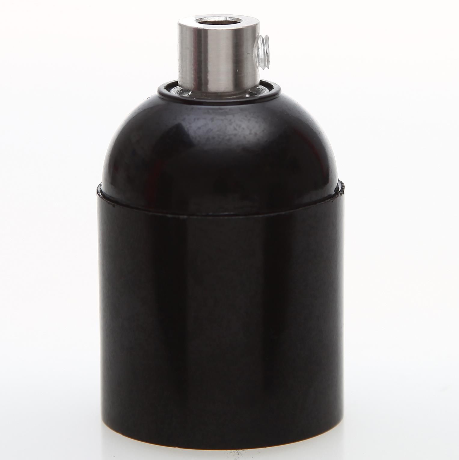 E27 Bakelit Glattmantel Lampenfassung schwarz mit Zugentlaster in Edelstahloptik