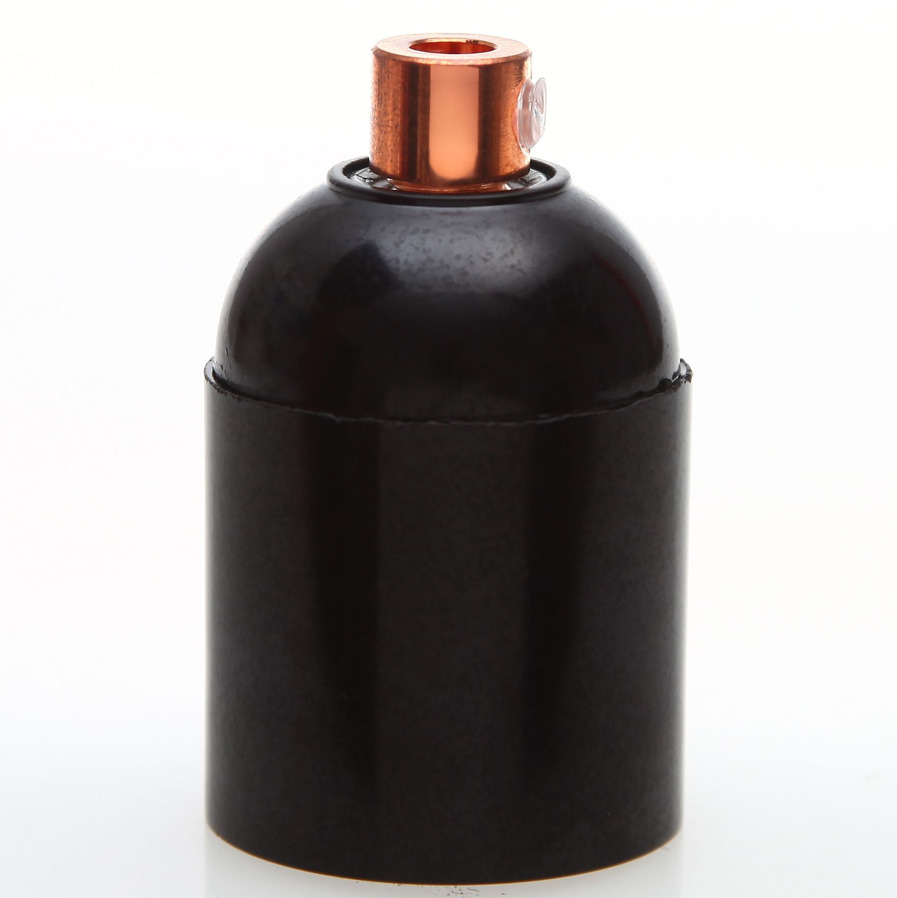Schwarze E27 Glattmantel-Fassung aus Bakelit mit Erdungspol und dekorativem Zugentlaster in Metall verkupfert. Robuste Bauweise, geeignet für Glüh-, Halogen-, Energiespar- und LED-Leuchtmittel bis 60W – ideal für individuelle Lampenprojekte im Retro-Design.
