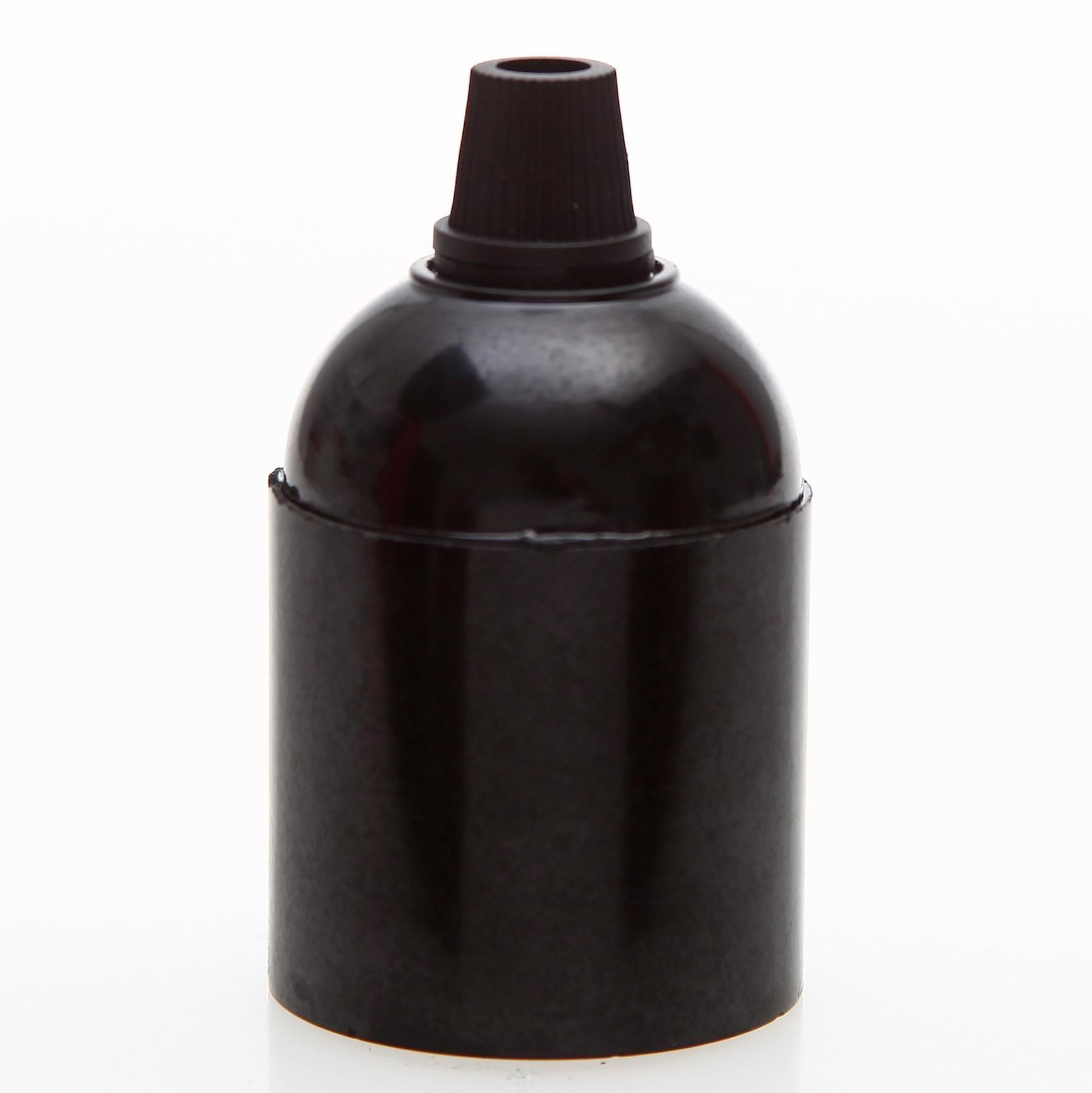Schwarze E27 Glattmantel-Fassung aus Bakelit mit Erdungspol und praktischem Kunststoff-Zugentlaster in Quetschverbindung. Robuste Ausführung, für Leuchtmittel bis 60W geeignet – ideal für sichere und stilvolle Lampenmontagen.