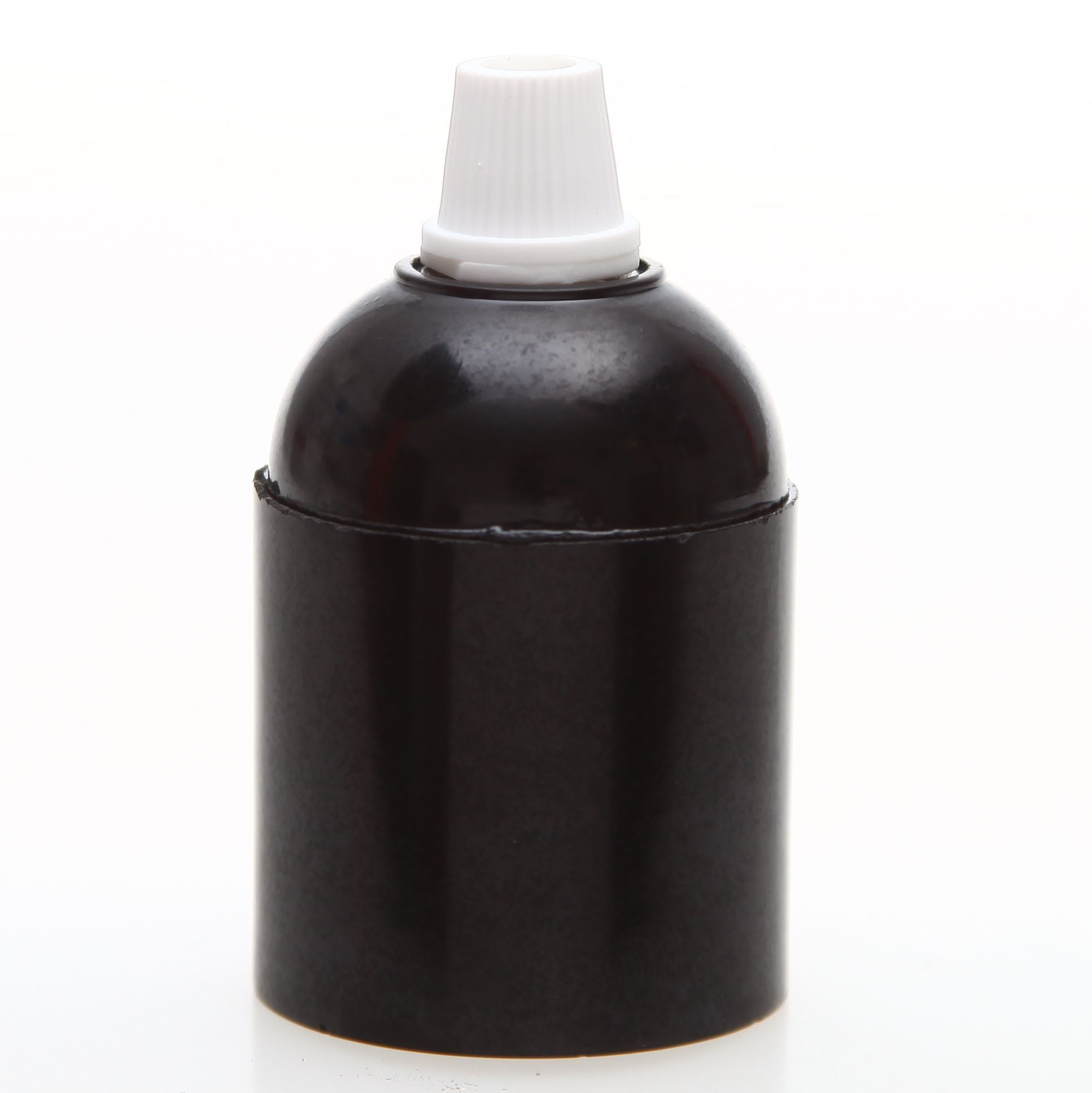 Robuste E27 Glattmantel-Fassung aus Bakelit in Schwarz mit Erdungspol und Kunststoff-Zugentlaster Quetschverbindung in Weiß. Für Leuchtmittel bis 60W geeignet – ideal für sichere Lampenmontagen und dekorative Leuchtenprojekte.