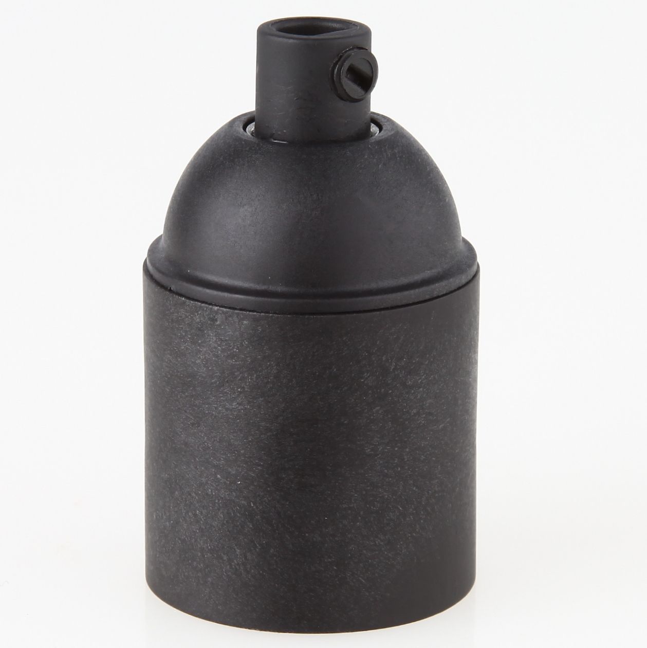 Schwarze E27 Kunststofffassung ohne Außengewinde, mit integriertem Zugentlaster. Ideal für den sicheren Lampenbau sowie für Leuchten ohne Lampenschirmbefestigung.
