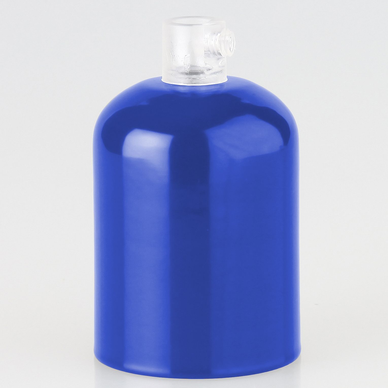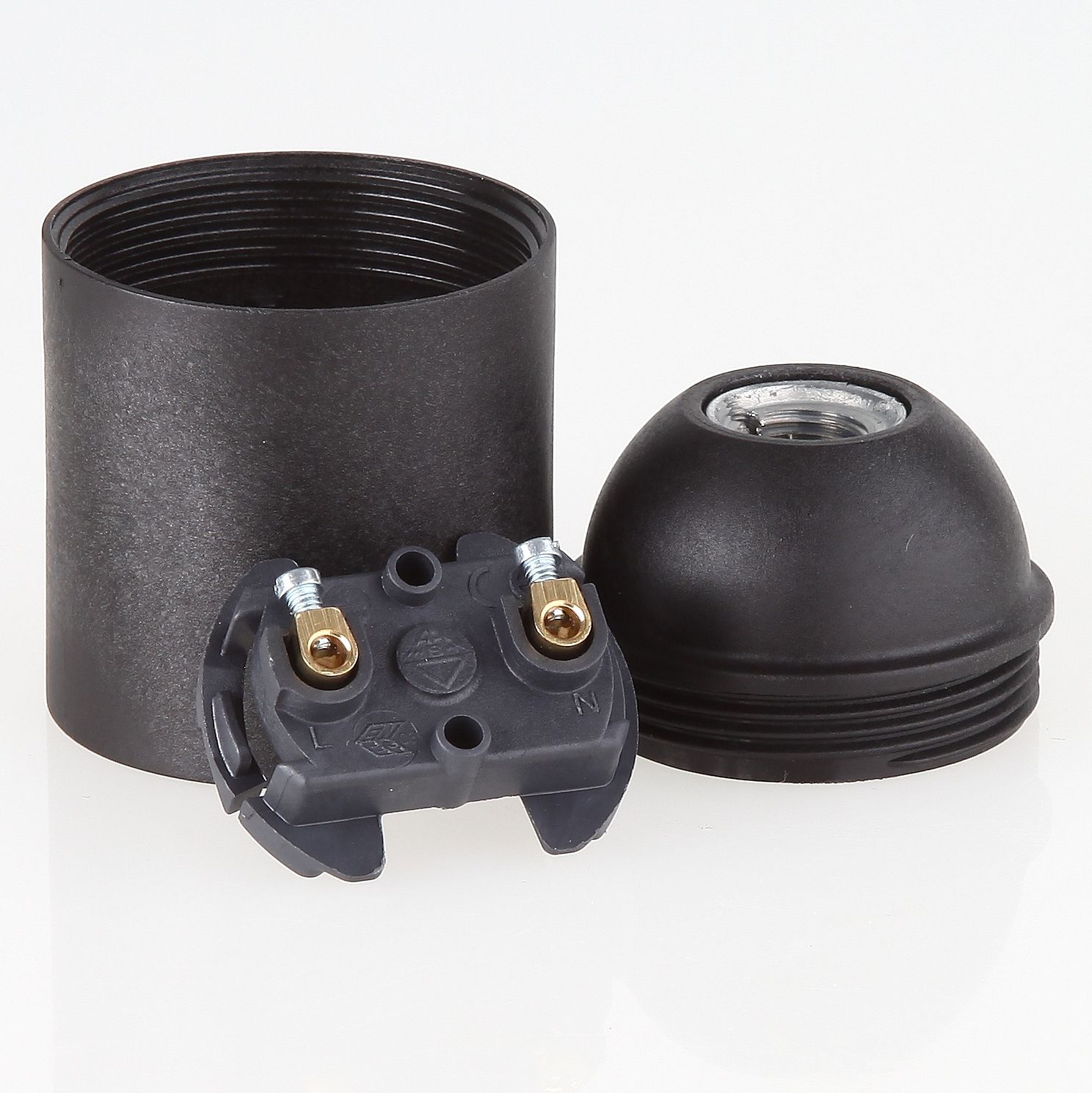 Komplett-Set bestehend aus 1 x E27 Metall-Fassungshülse, 1 x E27 Lampenfassung und 1 x Zugentlaster. Oberfläche dunkelblau, Maße 43 x 57 mm, Mittelloch 10,5 mm. Zur dekorativen Aufwertung von Leuchten – ohne Möglichkeit zur Schirmbefestigung.
