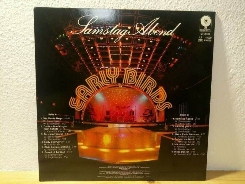 Early Birds - Samstag Abend VM Records LP 16039 Vinyl: NM-Cover: NM- A1 Via Monte Negro A2 Doch Schon Morgen, Mein Schatz A3 Du Mein Freund A4 Early Bird Guitar A5 Bleib Bei Mir, Mariana A6 Sound Of Trinidad B1 Samstag Abend B2 Ich Muß Geh'n B3 Live A Life In Harmony B4 Du Hast Die Wahl B5 Ich Träum