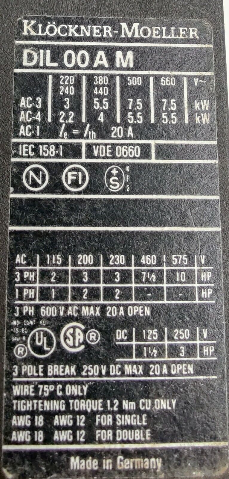 Eaton/Moeller DIL00AM, Leistungsschütz, 5,5 kW, 230/240 V AC-3, 061224