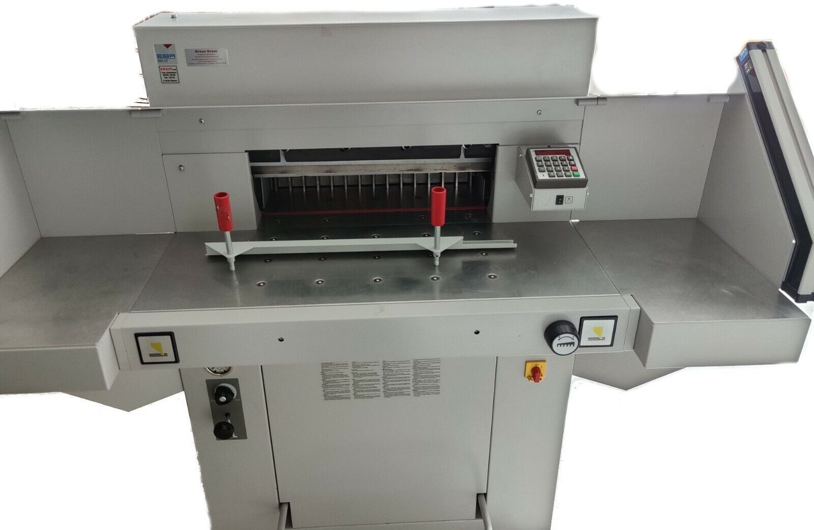 Wir bieten an: EBA 551 LT Hydraulischer Stapelschneider, 230V, 50Hz, 1,5kW, Gebraucht MASCHINENAUSSTATTUNG 1. hydraulischer Präzisionsantrieb für Messer und Pressbalken 2. elektro-mechanischer Antrieb für Rückanschlag über Präzisionsspindel 3. stufenlos regelbarer Pressdruck mit Anzeige (min. 200 ma