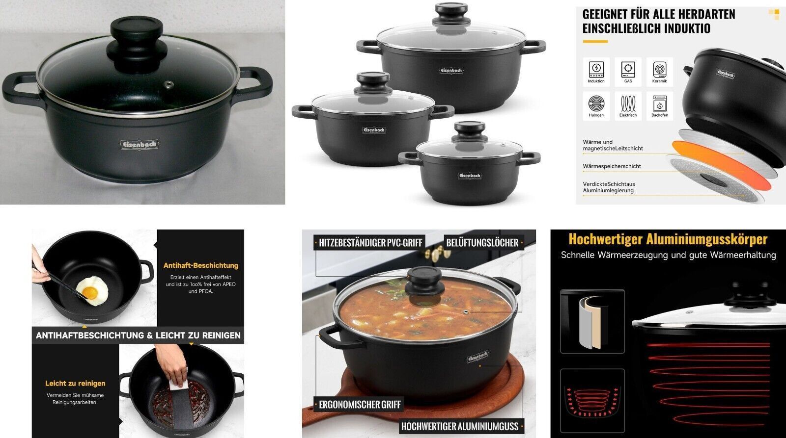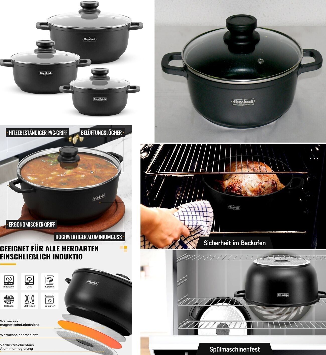 EBS0202428 Ø28x12,5cm 6,8L Koch Suppen Geschirr Casserole Topf Deckel Antihaft