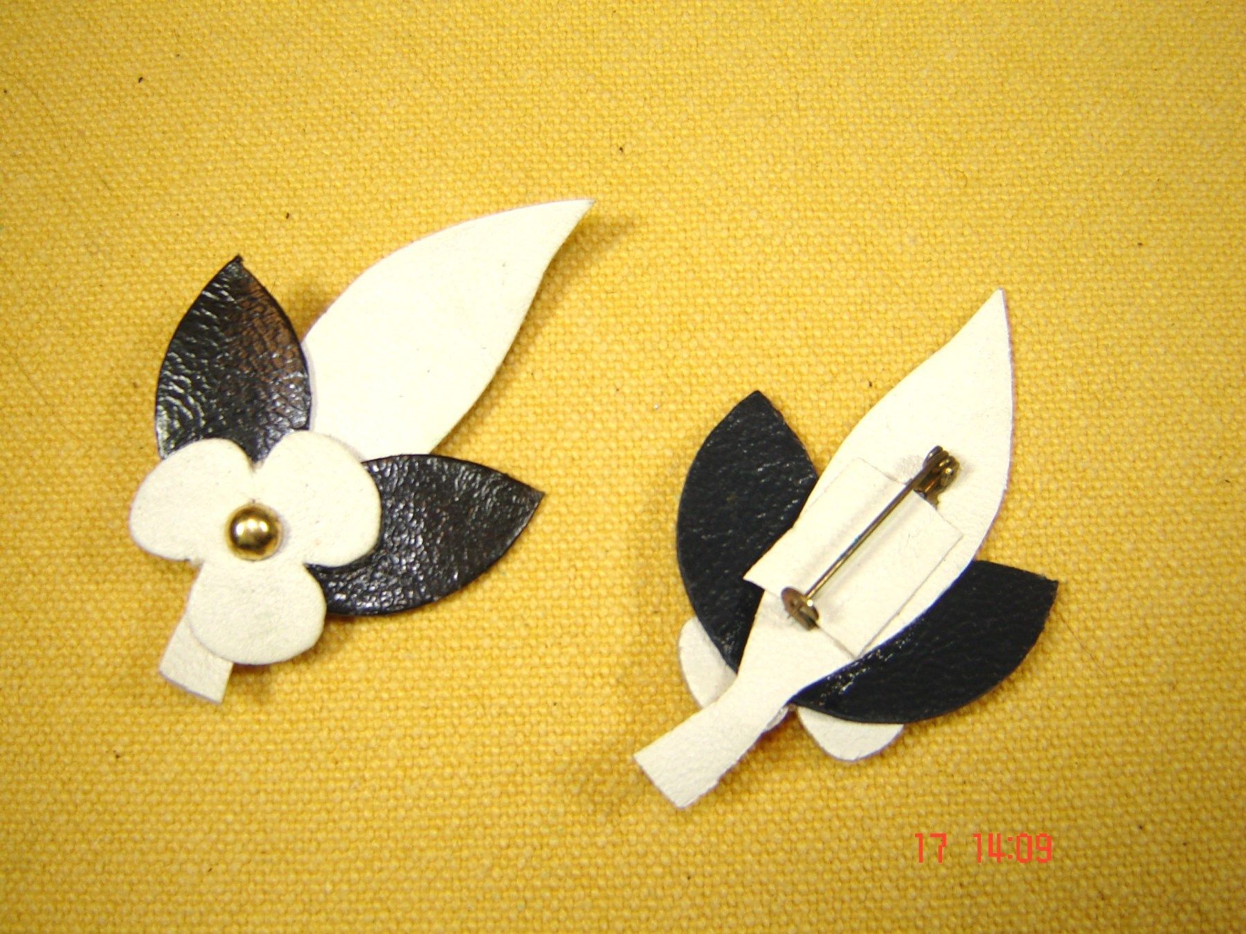 echt Leder Brosche Blumen Blätter schwarz weiß Anstecknadel handgearbeitet Vintage