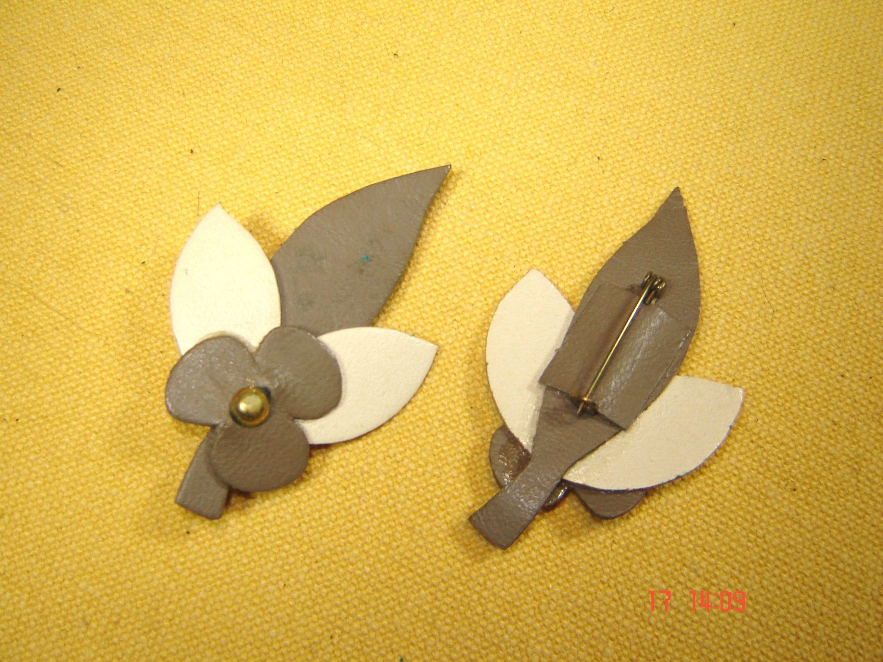 echt Leder Brosche Blumen Blätter grau weiß Anstecknadel handgearbeitet Vintage