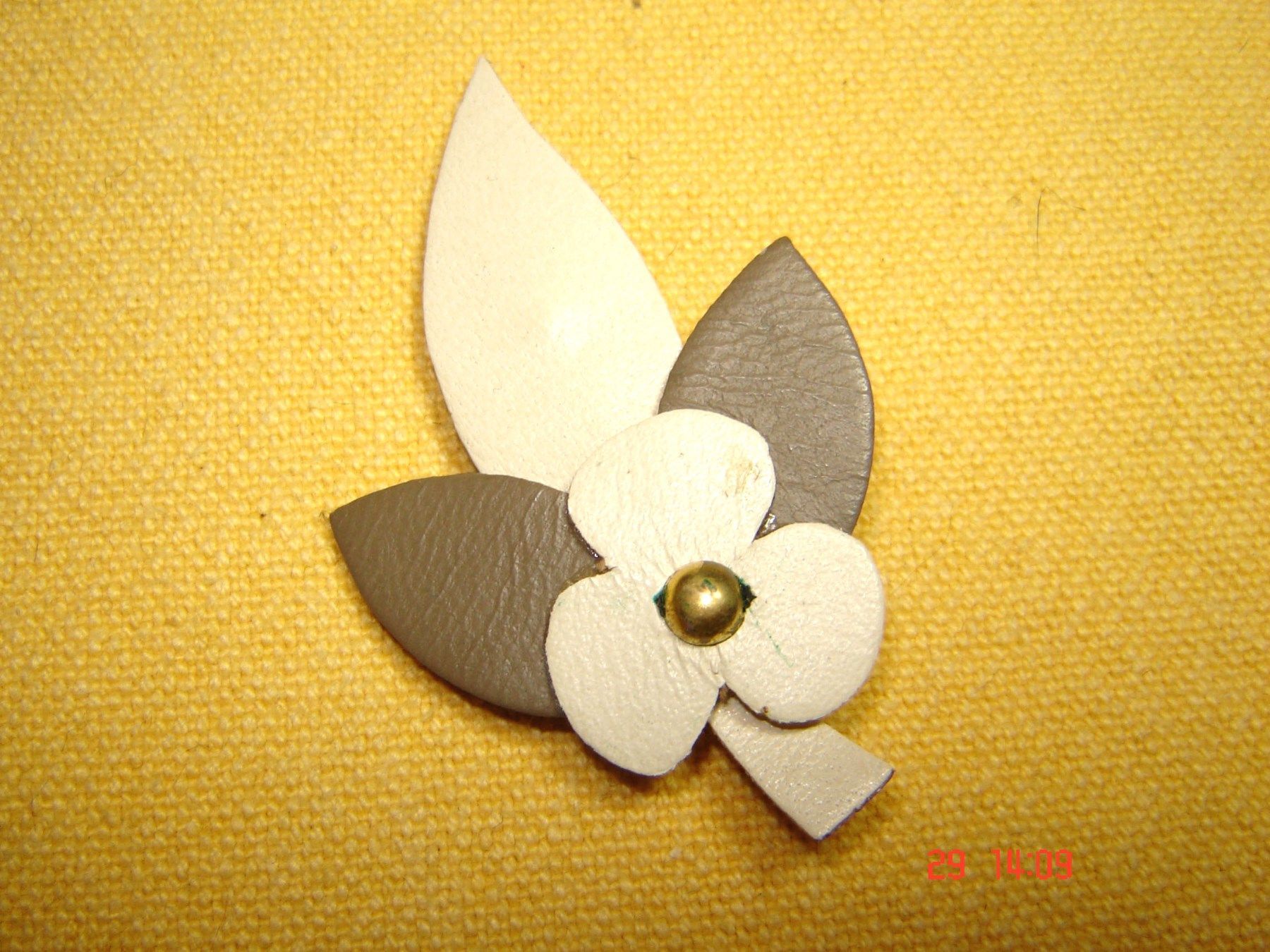 echt Leder Brosche Blumen Blätter grau weiß Anstecknadel handgearbeitet Vintage