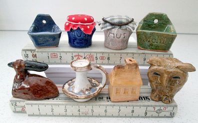 • 8 Mini Keramik Puppenhaus Setzkasten * Vorratsbehälter Bügeleisen Eule Kerzenhalter
