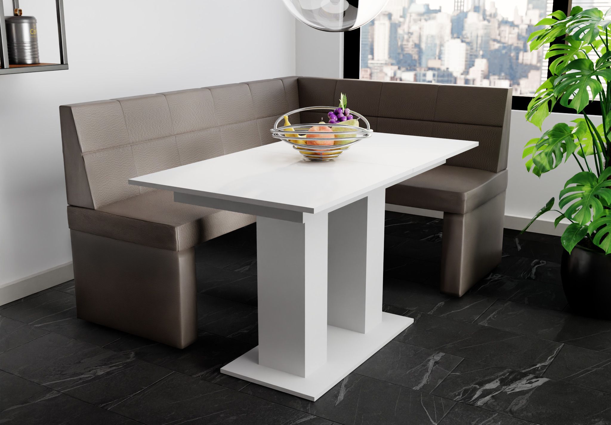 • Eckbankgruppe 168x128 cm ROBIN L Braun / Esstisch DANTE Weiss HGL